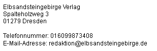 Die Internetseiten des Elbsandsteingebirge Verlages verwenden Cookies. Cookies sind Textdateien, welche über einen Internetbrowser auf einem Computersystem abgelegt und gespeichert werden.